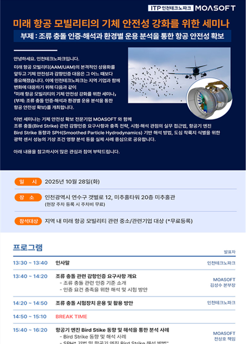 Home 교육 세미나 세미나 최신 산업 동향과 연구 성과를 공유하는 전문 세미나를 운영합니다. 교육 포럼 세미나 전체 1건 검색대상 제목내용 검색어 필수 검색검색 세미나 목록 종료 미래 항공 모빌리티의 기체 안전성 강화를 위한 세미나 장소 인천테크노파크 20층 미추홀관 접수기간 2025-09-01 ~ 2025-10-24 교육기간 2025-10-28 ~ 2025-10-28 View More > 처음 이전 1페이지 다음 맨끝 검색 검색대상 제목내용 검색어 필수 검색 닫기